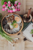 Brązowy ryż z owsianką umieścić ryżu brązowego z jajko na miękko i wieprzowina