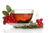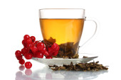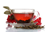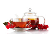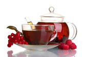 szklany czajnik i filiżanki herbaty czarnej i Kalina na białym tle
