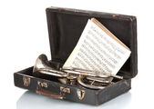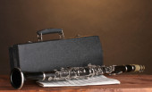 stary klarnet w przypadku na drewnianym stole na szarym tle
