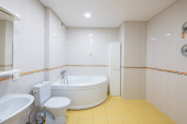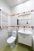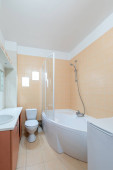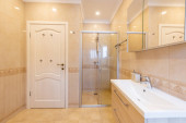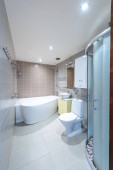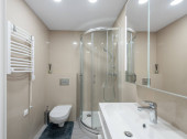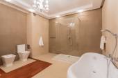 Zdjęcie "Stylowa nowoczesna łazienka z kompaktową konstrukcją z kabiną prysznicową, funkcjonalną pralką i płytkami podłogowymi, idealna do optymalizacji małych przestrzeni i utrzymania nowoczesnej estetyki." może być wykorzystywane do celów osobistych i komercyjnych zgodnie z warunkami zakupionej licencji Royalty-free. Obraz jest dostępny do pobrania w jakości wysokiej rozdzielczości do 5760x3840.