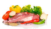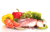 Surowe mięso i warzywa na deska na białym tle na Zielone Świątki?