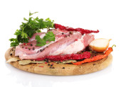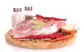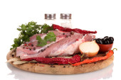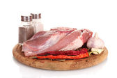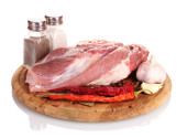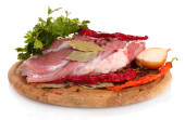 Surowe mięso i warzywa na deska na białym tle na Zielone Świątki?