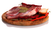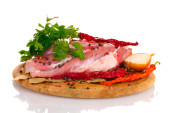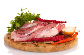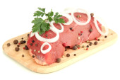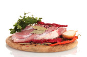 Surowe mięso i warzywa na deska na białym tle na Zielone Świątki?