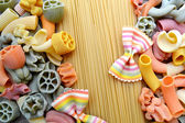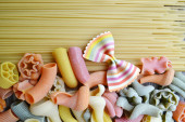 Zbiór różnego rodzaju kolorowe włoski makaron na drewnianym stole