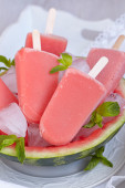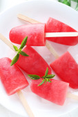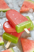 Smaczne słodkie lody arbuzowe lizaki na niebieskim drewnianym stole, widok z góry. Letnie wakacje i tło wakacyjne z lizakami owocowymi arbuza, przestrzeń do kopiowania z góry