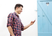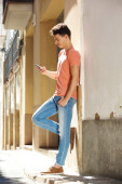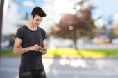 Przystojny młodzieniec, czytanie tekstu na telefon komórkowy