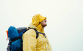 young caucasian female hiker in mountains, woman hiking in the fog with a backpack in Crimea
