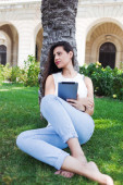 Brunette model nosi różowy top i białe szorty, siedząc na trawie w parku, opierając się na drzewo podczas czytania książki szczęśliwie