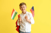 Afro amerykański biznesmen, trzymając flagi świata