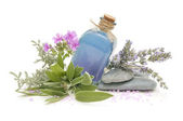Świeże kwiaty lawendy i oleju lawendy na białym tle