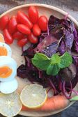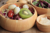 świeży szpinak czerwona sałatka i krem na drewnianym stole