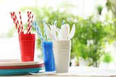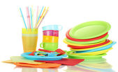 jasne, plastikowe naczynia i serwetki na białym tle