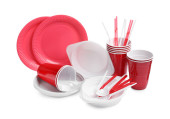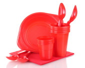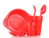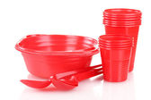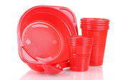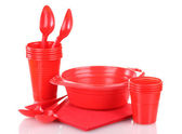 jasne czerwone plastikowe naczynia i serwetki na białym tle