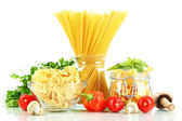 spaghetti, makaron w misce, słoik oleju i warzywa na drewnianym stole isola