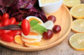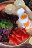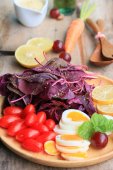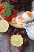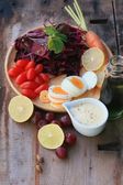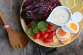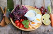 świeży szpinak czerwona sałatka i krem na drewnianym stole