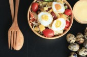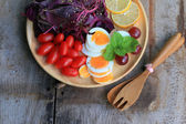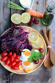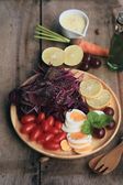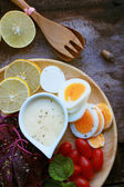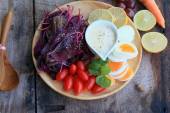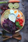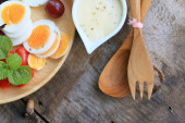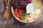 świeży szpinak czerwona sałatka i krem na drewnianym stole