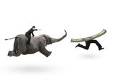 Biznesmen za pomocą głośnika krzyczeć na słonia na pojedyncze drewniane b