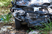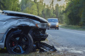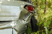 Srebrny sedan przewrócony nad czarnym pojazdem są splątane po kolizji na cichej, zalesionej drodze.