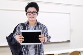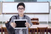 Zdjęcie "Student shows tablet in the library" może być wykorzystywane do celów osobistych i komercyjnych zgodnie z warunkami zakupionej licencji Royalty-free. Obraz jest dostępny do pobrania w jakości wysokiej rozdzielczości do 5760x3840.