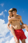 Seksowna blondynka jazda na faceta i pokazuje kciuk w górę