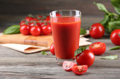 szklankę soku pomidorowego z warzywami na drewniane tła