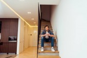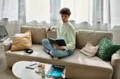 Zdjęcie "Młody mężczyzna wygodnie wypoczywa na kanapie, koncentrując się na czytaniu i relaksie w domu." może być wykorzystywane do celów osobistych i komercyjnych zgodnie z warunkami zakupionej licencji Royalty-free. Obraz jest dostępny do pobrania w jakości wysokiej rozdzielczości do 5760x3840.