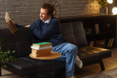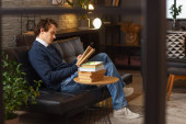 Młody mężczyzna wygodnie wypoczywa na kanapie, koncentrując się na czytaniu i relaksie w domu.