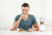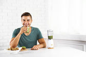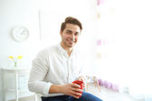 Młody człowiek człowiek wylewanie kiwi świeże sok do szklanki