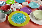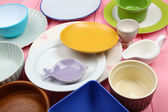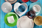 Różne naczynia na drewnianym stole z bliska