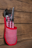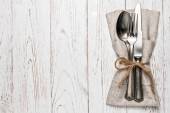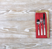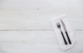 Drewniane białe tło do karty menu z sztućce w czerwonym Zielone Świątki