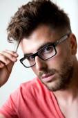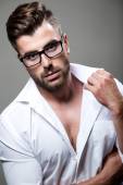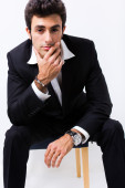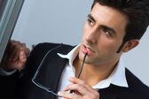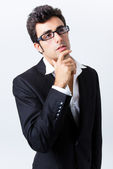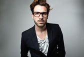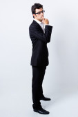 ekspresyjny biznesmen w czarnym garniturze i okulary