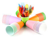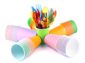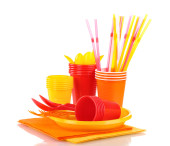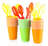 jasne, plastikowe naczynia i serwetki na białym tle