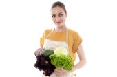 kobieta trzyma worek spożywczy pełen chleba i warzyw