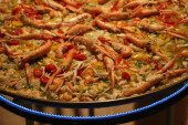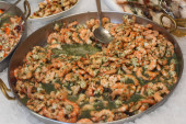Hiszpański paella z ryżu i krewetki gotowane w garnku