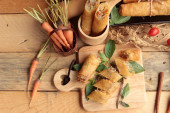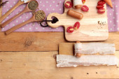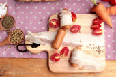 Zawijane w boczek surowy tłuszcz na pyszne kiełbaski.