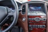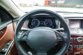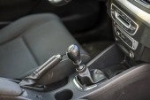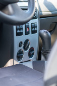 To zbliżenie zdjęcie wnętrza samochodów podkreśla szczegółową zmianę biegów, rozmieszczone urządzenia sterujące deską rozdzielczą i zapłon klucza, zwiększając autentyczne wrażenia z jazdy