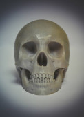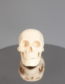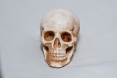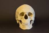 Realistyczny model anatomiczny ludzkiej czaszki widzianej z przodu. Szczegóły obejmują pełne uzębienie, otwór nosowy i oczodoły, co czyni go idealnym do nauczania anatomii szkieletowej człowieka.