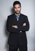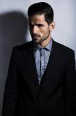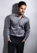 przystojny młody mężczyzna w kostiumie na szarym tle
