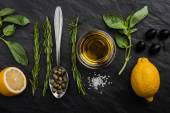 Olive oil with lemon , capers and different greens horizontal