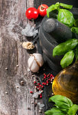 Herbs mix with tomatoes and olive oil on the black stone table
