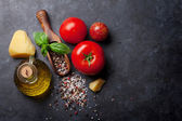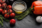 Olive oil with vegetables , lemon and capers on the black stone table