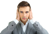 Biznesmen, księgowy i dyrektor finansowy obejmujący jego uszy