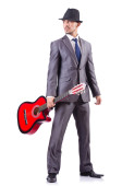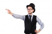 Mężczyzna w szarym koszula i czarny kapelusz na białym tle