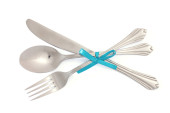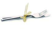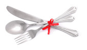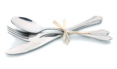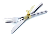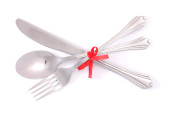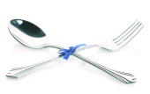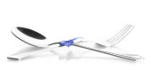 Silver widelec i łyżka, nóż, związany z niebieską wstążką na białym tle