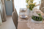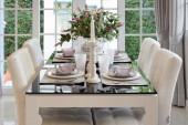 Zdjęcie "tabela na ciemno brązowy drewniany stół w jadalni" może być wykorzystywane do celów osobistych i komercyjnych zgodnie z warunkami zakupionej licencji Royalty-free. Obraz jest dostępny do pobrania w jakości wysokiej rozdzielczości do 5760x3840.