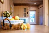 Wnętrze kuchenne drewniane. Ozdobny koszyk z owocami na stole