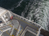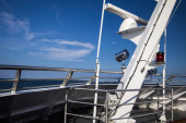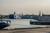 Zbliżenie liny dokującej przywiązanej rękawiczkami na promie w Wenecji. Wysokiej jakości zdjęcie