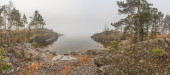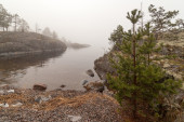 Mgła na kamienistym wybrzeżu jeziora. pejzaż wiosna