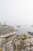 Mgła na kamienistym wybrzeżu jeziora. pejzaż wiosna