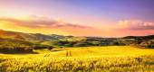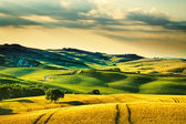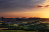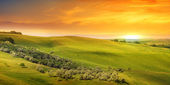 Toskania, wiejskiego krajobrazu na zachód słońca, Włochy. jezioro i zielone pola